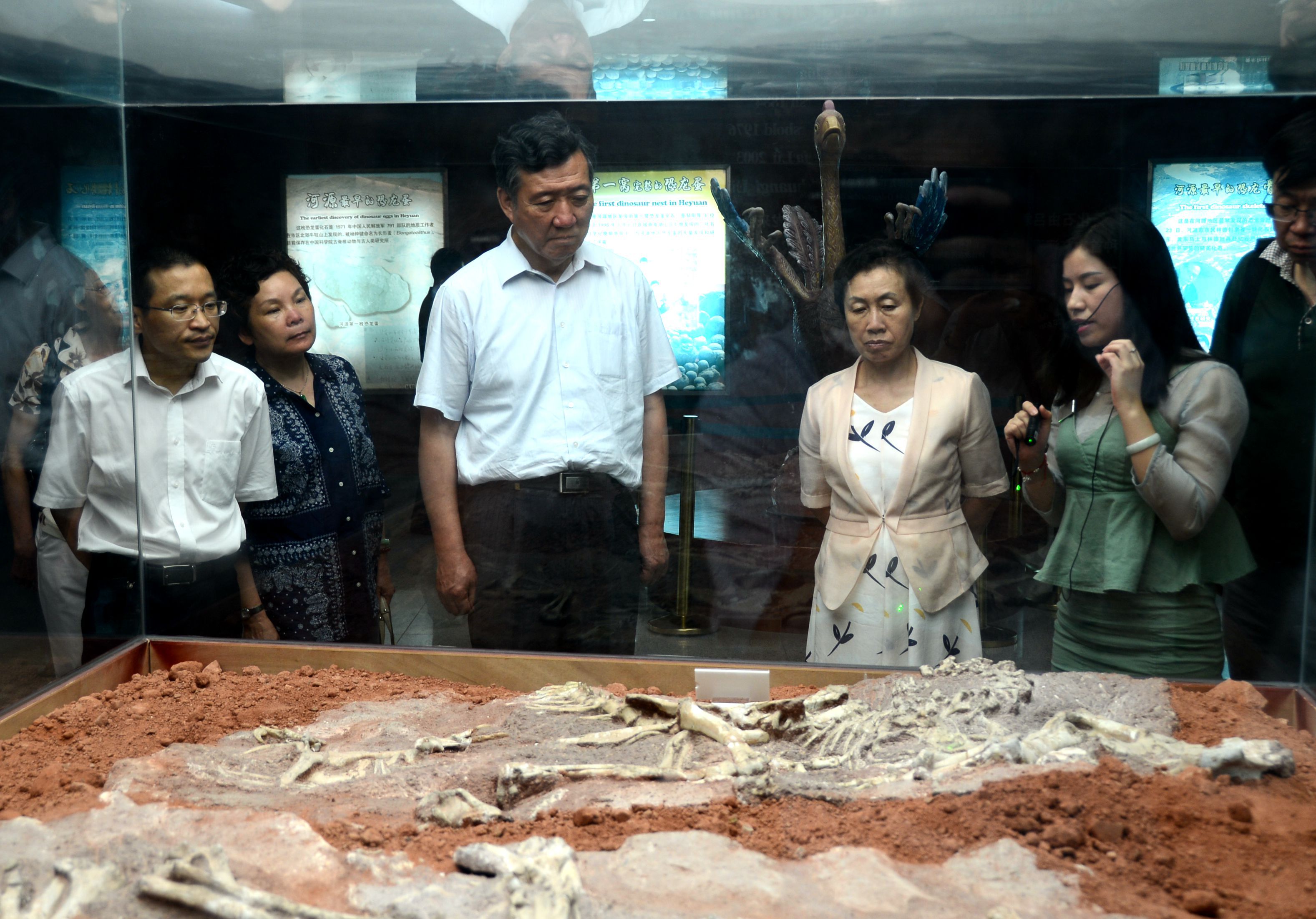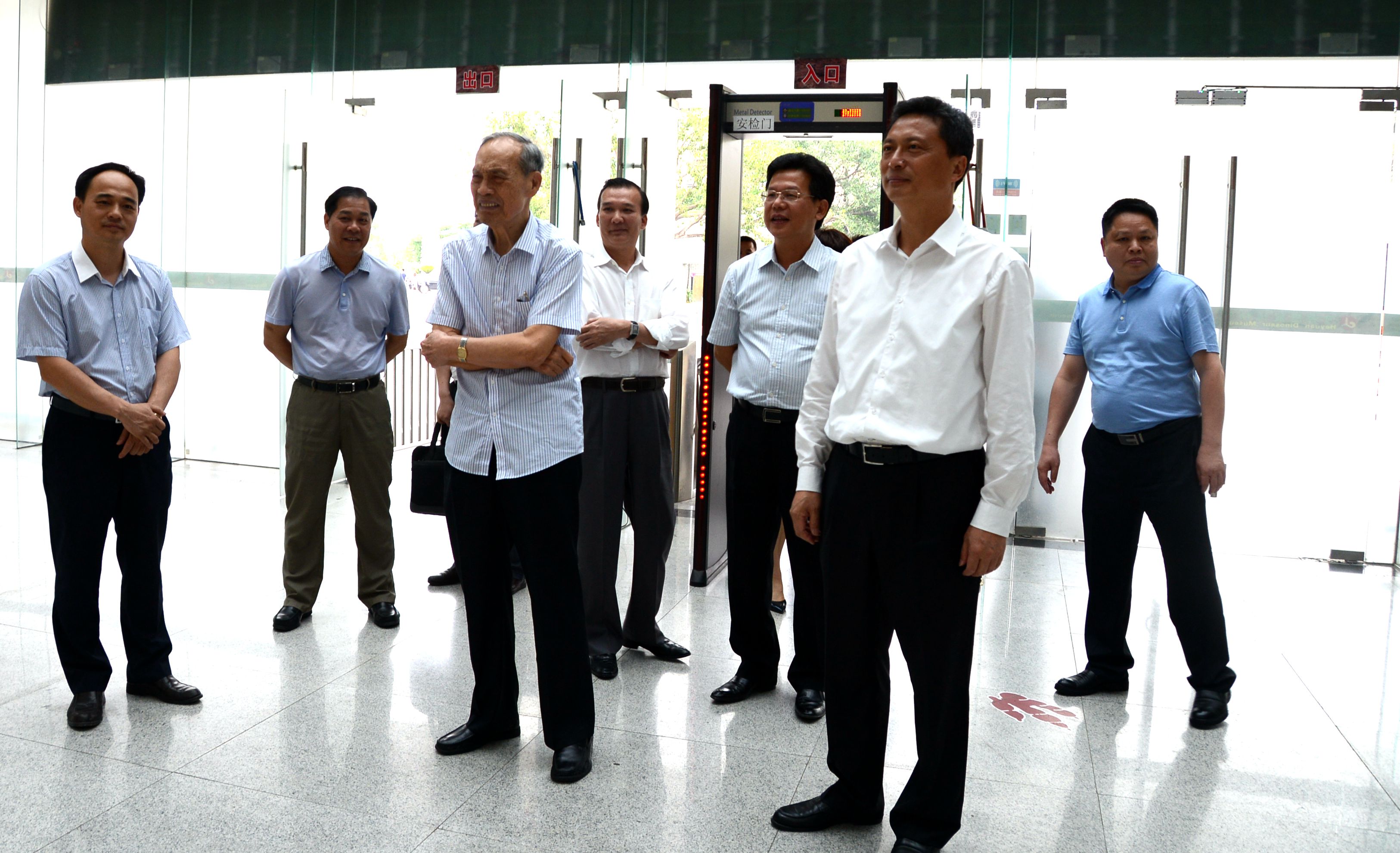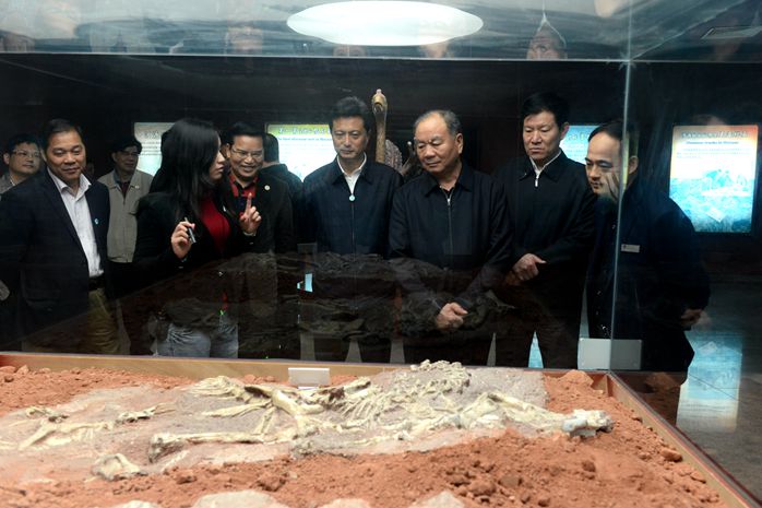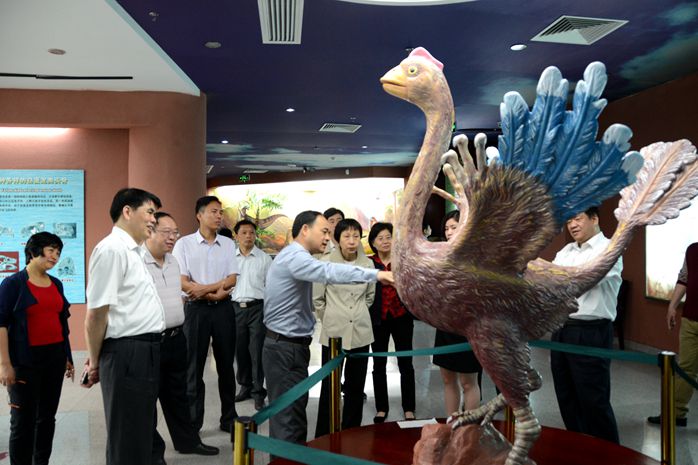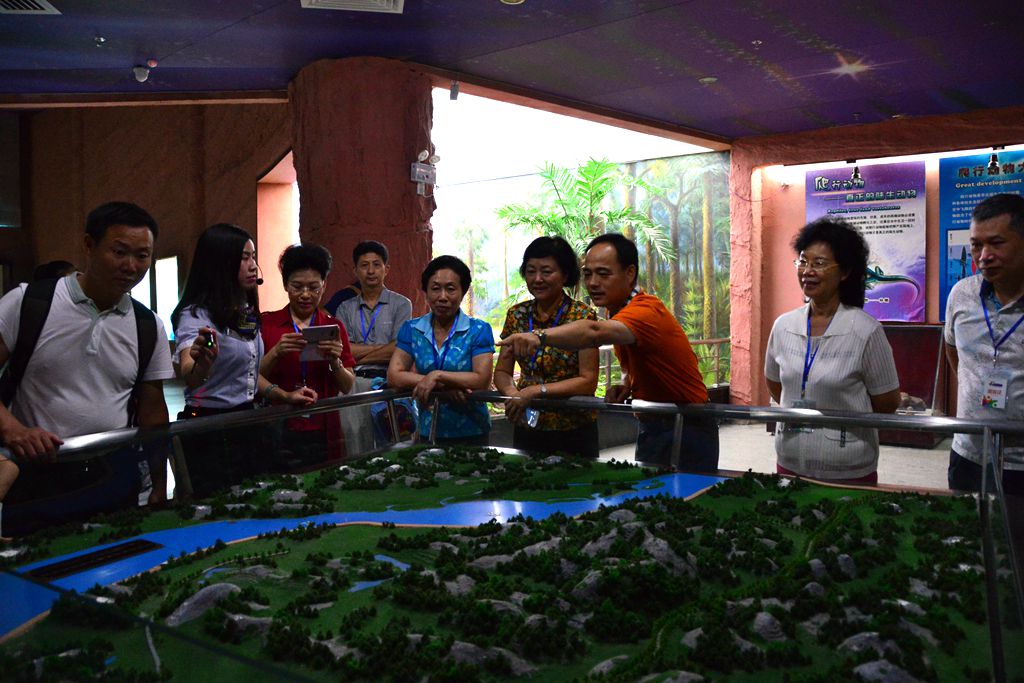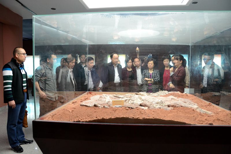 2016年8月7日,在市政協(xié)主席龔佐林(左四)的陪同下,廣東省人大常委會原副主任、省教育基金會理事長雷于藍(lán)(左三)、珠海市人大常委會副主任鄧群芳(左二)等領(lǐng)導(dǎo)到河源恐龍博物館考察調(diào)研。