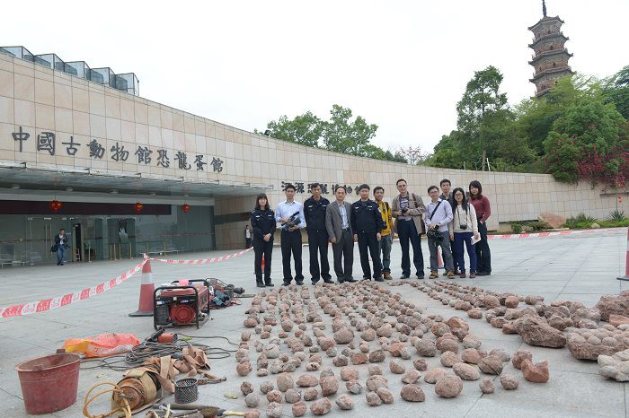 在博物館前清點(diǎn)恐龍蛋化石并舉行新聞發(fā)布會(huì)