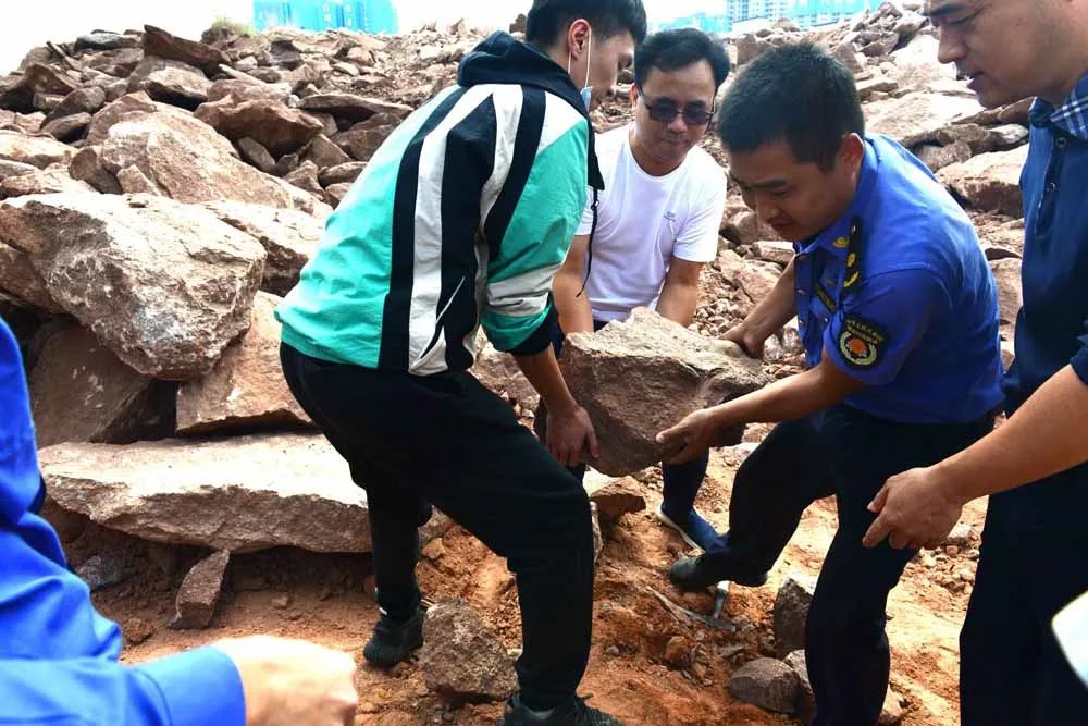 據(jù)河源恐龍博物館館長杜衍禮介紹,事發(fā)當(dāng)天上午11時(shí)左右,江東新區(qū)行政綜合執(zhí)法局執(zhí)法隊(duì)員在江東新區(qū)勝利村影盤嶺(地名)附近進(jìn)行常規(guī)巡查時(shí),發(fā)現(xiàn)勝利村鬼瀝橋(地名)一處已停工的紅砂巖層的施工工地上,不時(shí)有揚(yáng)塵冒起。執(zhí)法隊(duì)員立馬警覺起來,遠(yuǎn)遠(yuǎn)就看見現(xiàn)場工地上有2~3人在鬼鬼祟祟地用電動(dòng)切割工具在偷挖盜取工地埋藏的恐龍蛋化石,立即組織包抄,同時(shí)將發(fā)現(xiàn)的相關(guān)情況先后報(bào)告給河源恐龍博物館和城東派出所。