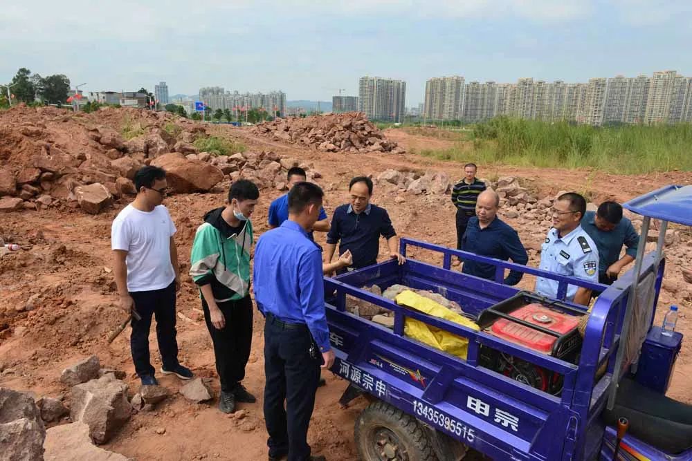 執(zhí)法人員將嵌有恐龍蛋化石的紅砂巖塊集中撿拾起來。